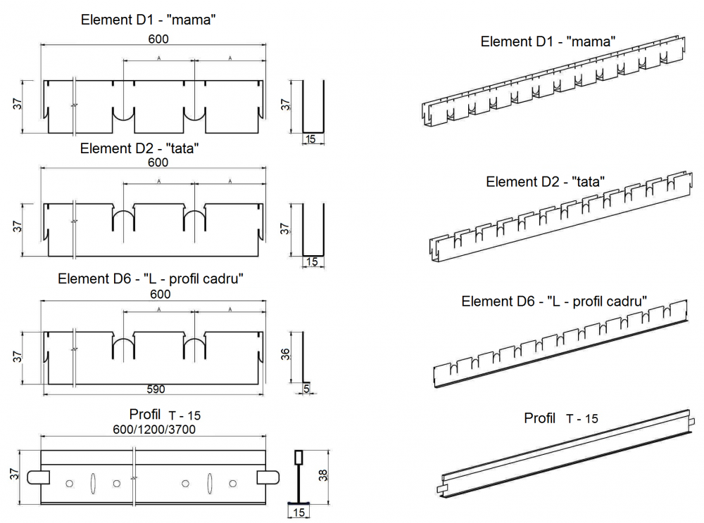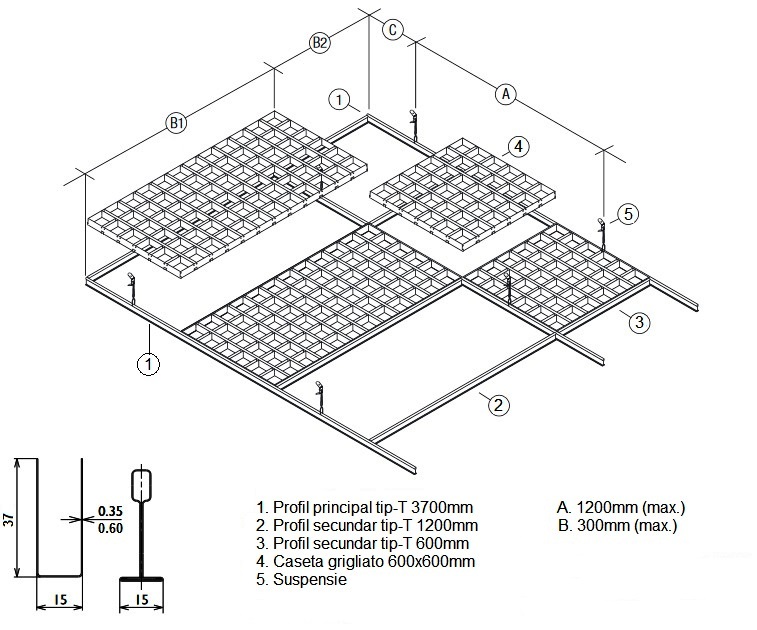 Sistemul Grillato CL-T15 este compus din grile separate în volum și sistemul de suspendare „profil - T“ de 15 mm lățime. Grilele în volum sunt formate de profilurile în formă de U, care se intersectează. De-a lungul perimetrului, grila este încadrată de profile în formă de L. Fiecare grilaj separat poate fi ușor așezat în celula standard a sistemului de suspendare T-15. La finalizarea instalării grilajelor pe sistemul de suspendare este dificil de a face vizual diferența dintre T-profilurile sistemului de suspendare și U-Profilurile sistemului Grillato, adică suprafața crează impresia unei structuri integre (continue).