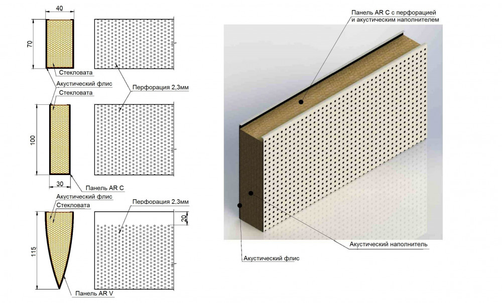 Для того чтобы обеспечить оптимальный акустический контроль в помещениях, панели могут быть перфорированными. . В качестве стандартной функции, перфорированные панели снабжены звукопоглощающим нетканым материалом наклеенным на внутренней поверхности панели и заполнены минераловатой.